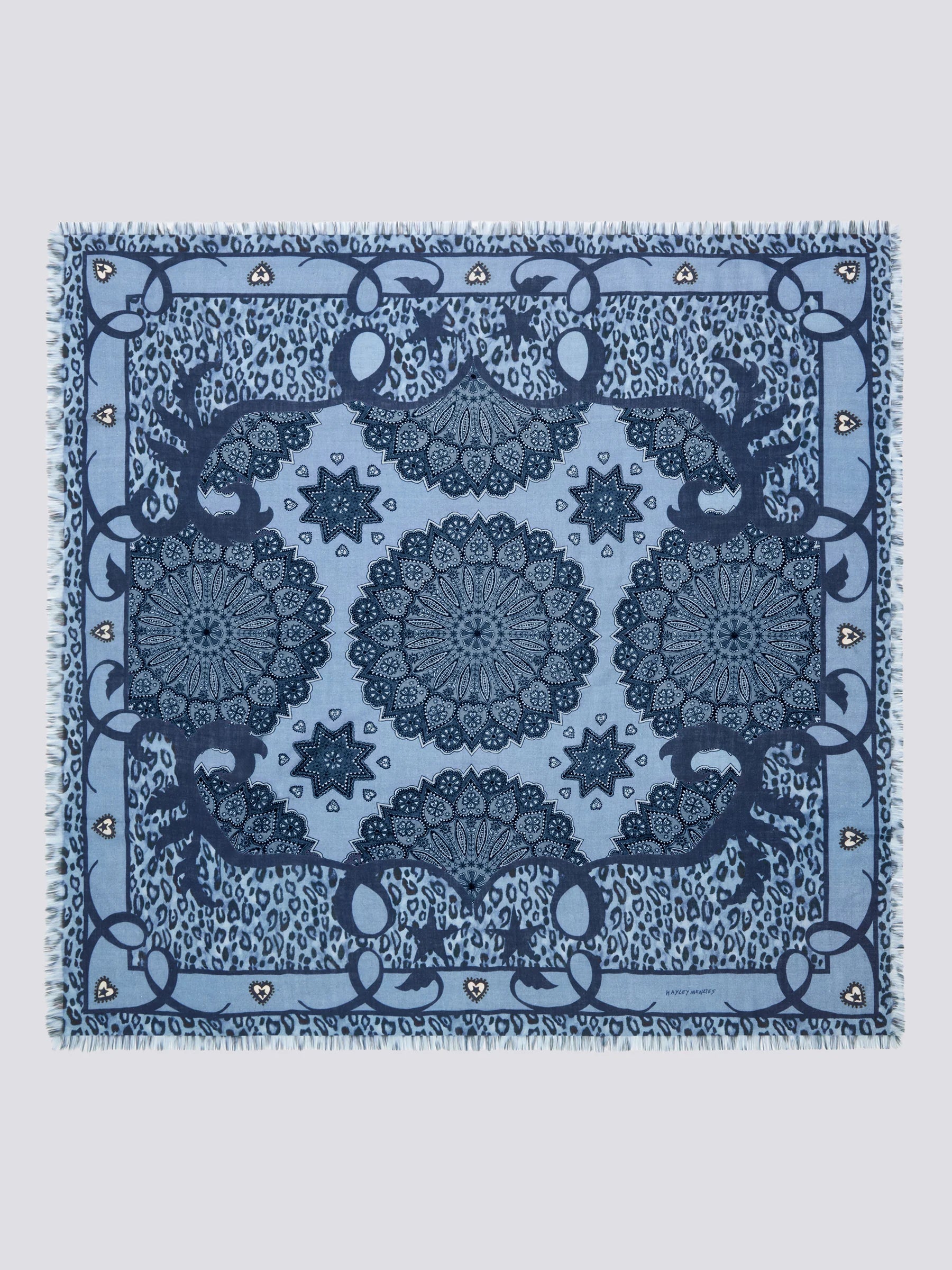 Wrap yourself up against the elements with the Dalton Cashmere Wool Scarf, an elevated take on Hayley Menzies' bestselling Dalton print. For her first foray into scarves in almost a decade, Hayley's iconic bandana design meets soft, luxurious cashmere in cool denim blue. Finished with tonal leopard print detailing and bold border accents, it’s perfect for draping over tailored coats and jeans for added warmth and drama.