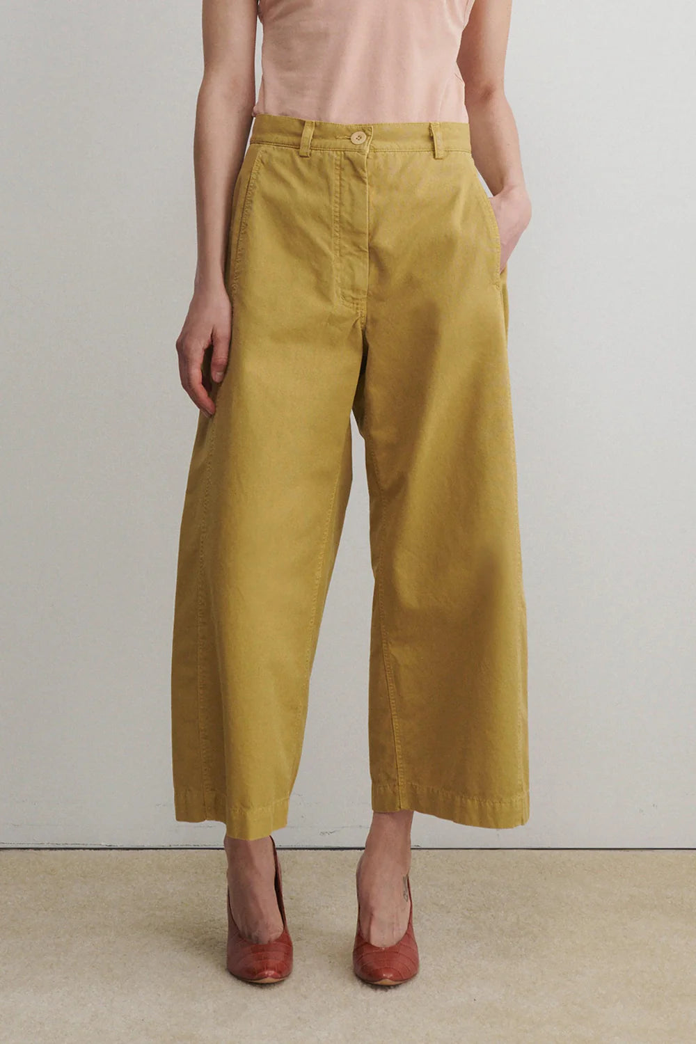 The Garra Pant is a high-waisted, flat-front, relaxed fit jean with a wide, rounded leg, with side panels elongate the silhouette. Cut in a lightweight cotton canvas. Styled here on a tall model, the pant appears cropped, but will be ankle length if you're under 5' 6'.
