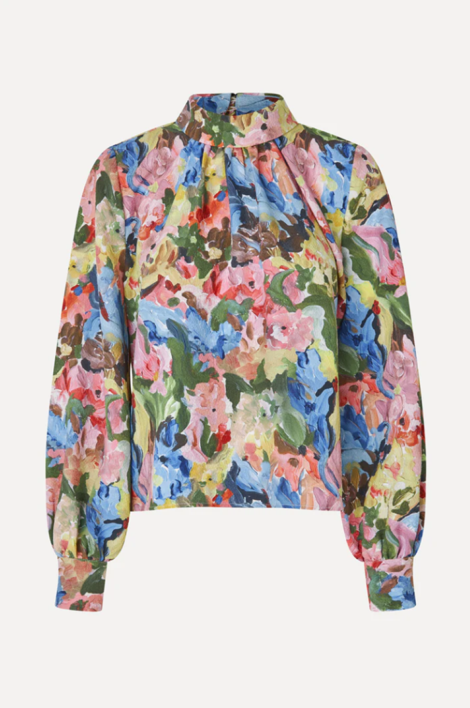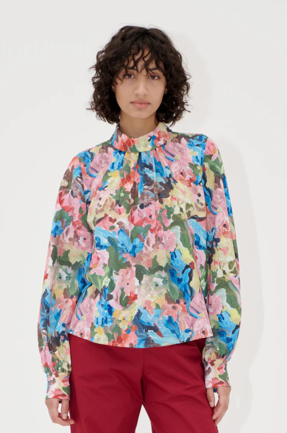 Flowy blouse with long cuffed sleeves, turtleneck with ruching detail and floral pattern. Pair with the matching Elasticated Long Pants in Loves Me, Loves Me Not.